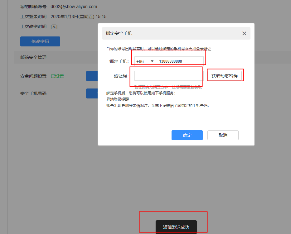 3、然后通过手机的动态密码验证手机有效性后就可以绑定手机号码。动态密码有效期为5分钟。